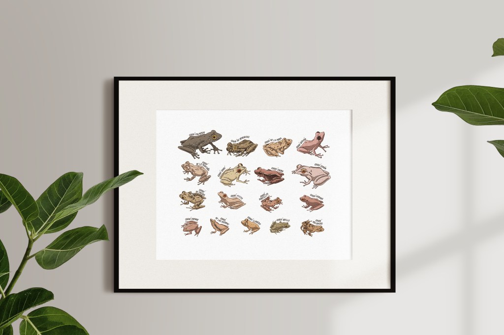 Below, screenprinted coquí tee, giclée print on watercolor paper and screenprinted tote bag.